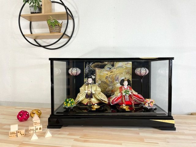 ガラスケース 《 煌 》親王飾り 和室にも洋室にも合い、『 Luxury感漂う 』親王飾り。 お人形は、川秀オリジナル親王 男雛・女雛ともに高級刺繍生地を使用して作られ素敵なお人形に仕上がりました。 ケース背景には加賀蒔絵が施され豪華さをを一層引き立てます。 (W)610 × (D)360 × (H)340