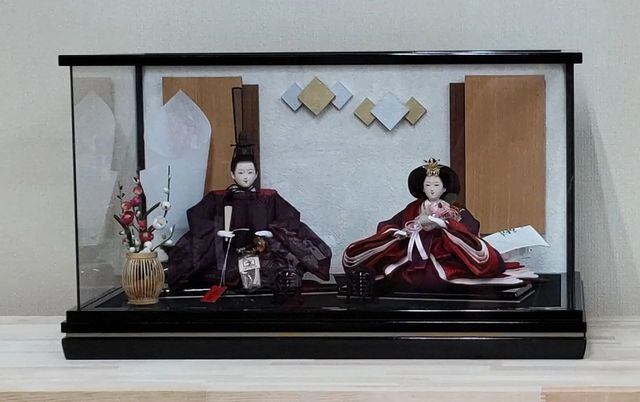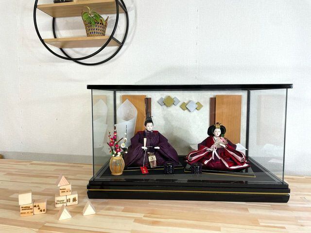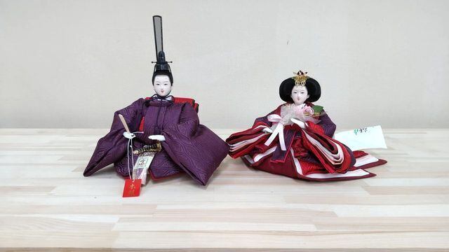 男雛・女雛ともに 有職金襴『 古代紫 』の生地を使用して作られ素敵なお人形に仕上がりました。