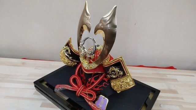 背景には洋風でモダンな木目調に金と銀の飾りを取り付けました。勇ましさと優しさ溢れています。