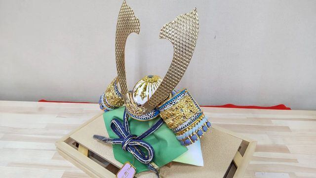 背景には洋風でモダンな木目に金と銀の飾りを取り付けました。勇ましさと優しさ溢れています。