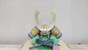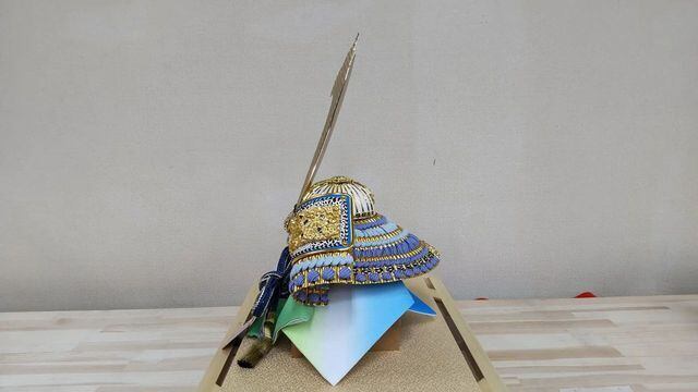 ホワイトカラーの兜鉢に淡い水色の段縅が素敵な白木の兜ケース飾りです。