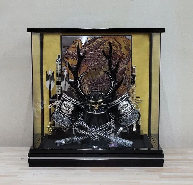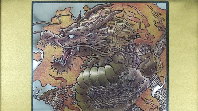 背景には迫力ある龍が勇ましさを引き立たせています。