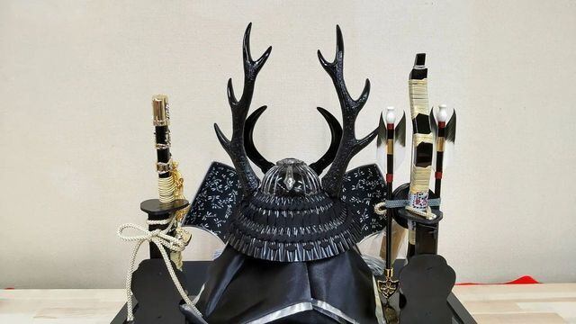 前立の獅噛と脇に鹿角が特徴的で魅力的な兜です。