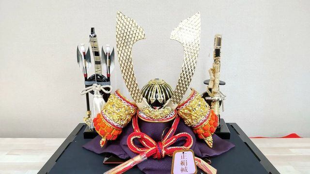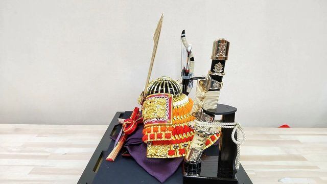 高級感あふれる赤糸縅兜ケース飾りです。