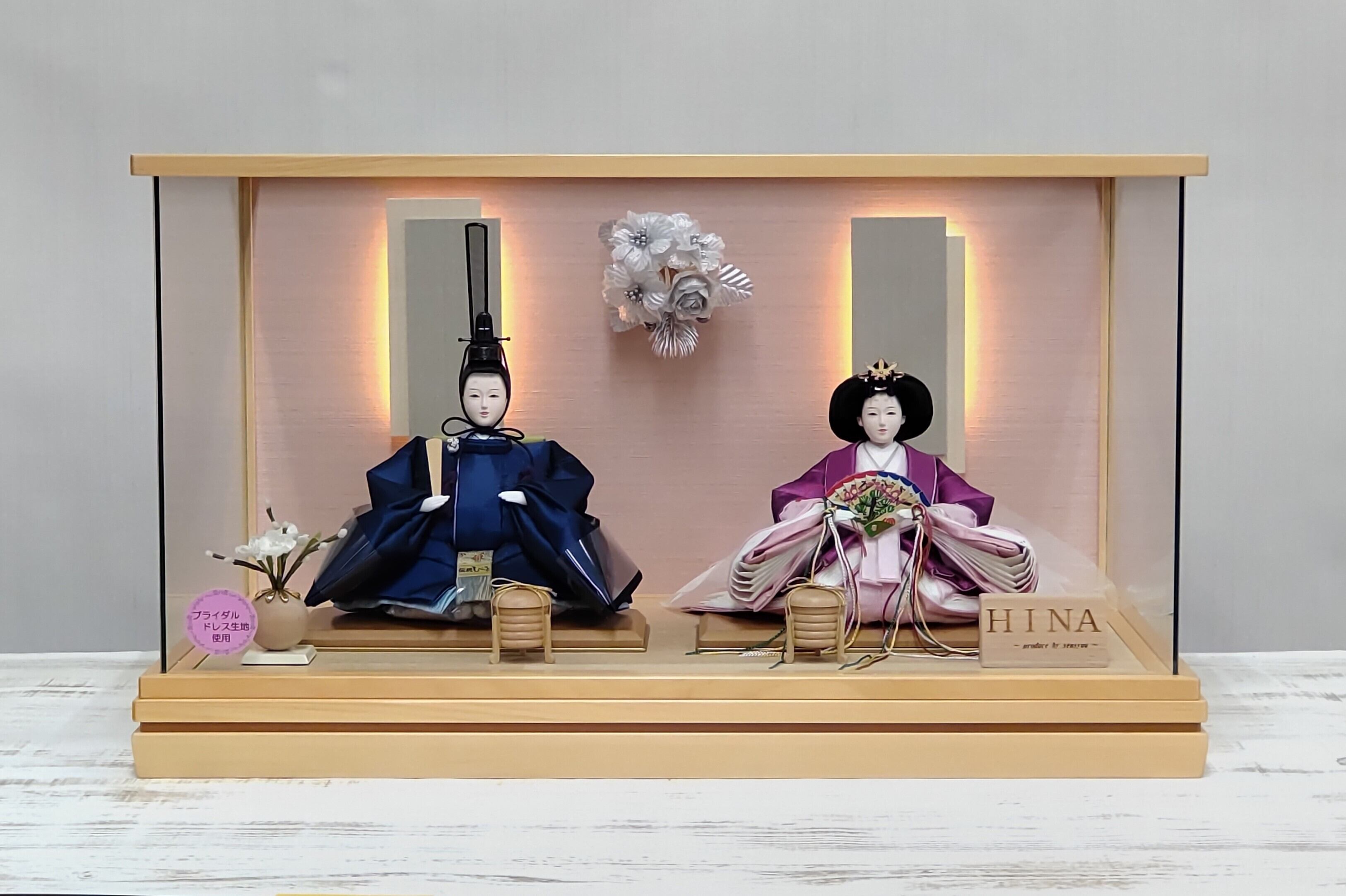 男雛と女雛の衣装には幸せな結婚式を彩るために生まれたドレス生地を使用したお内裏さまです。